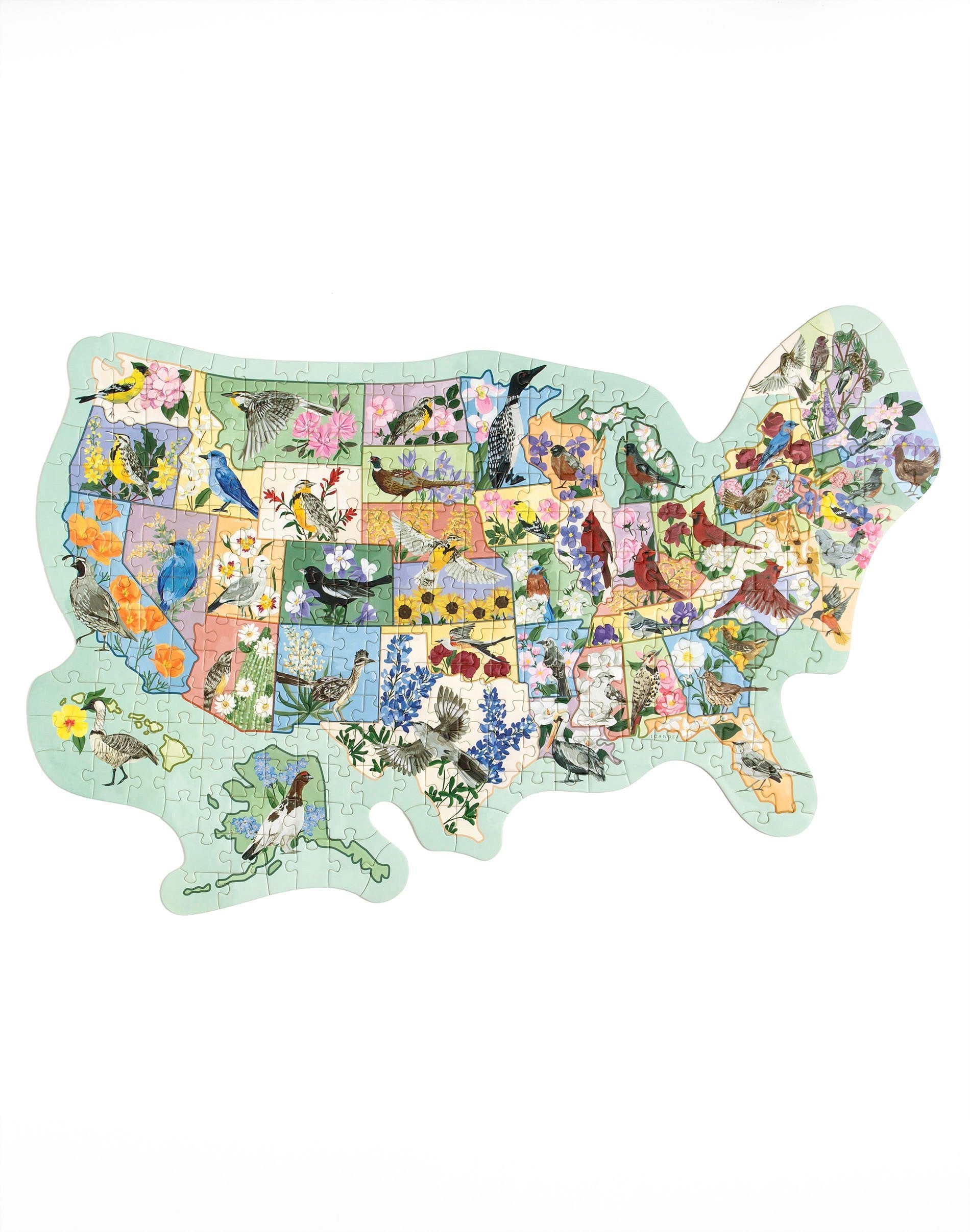 Shaped like the USA, this 300-piece puzzle features illustrations of each state's state flower and bird, creating a colorful and educational mosaic of flora and fauna. Putting it together offers a delightful journey across the nation's natural beauty.
