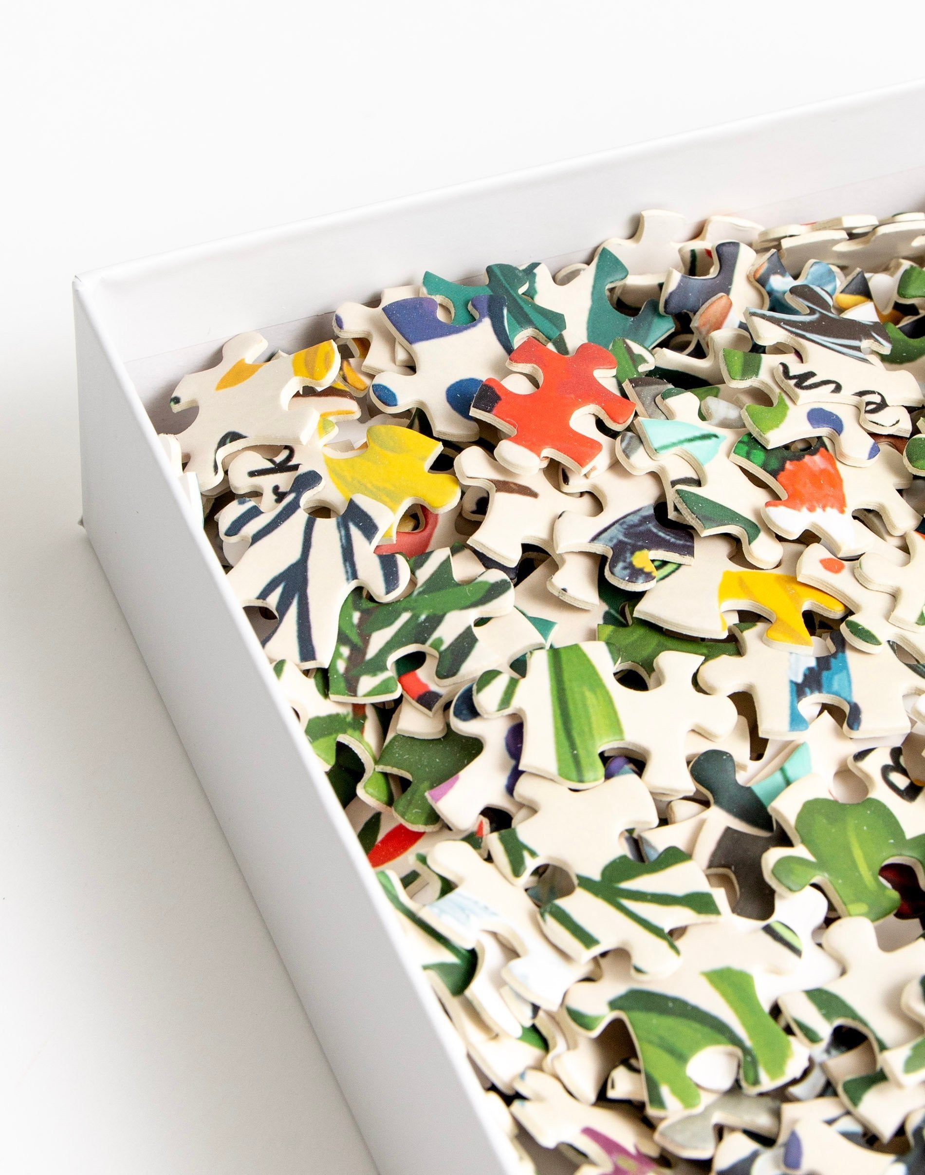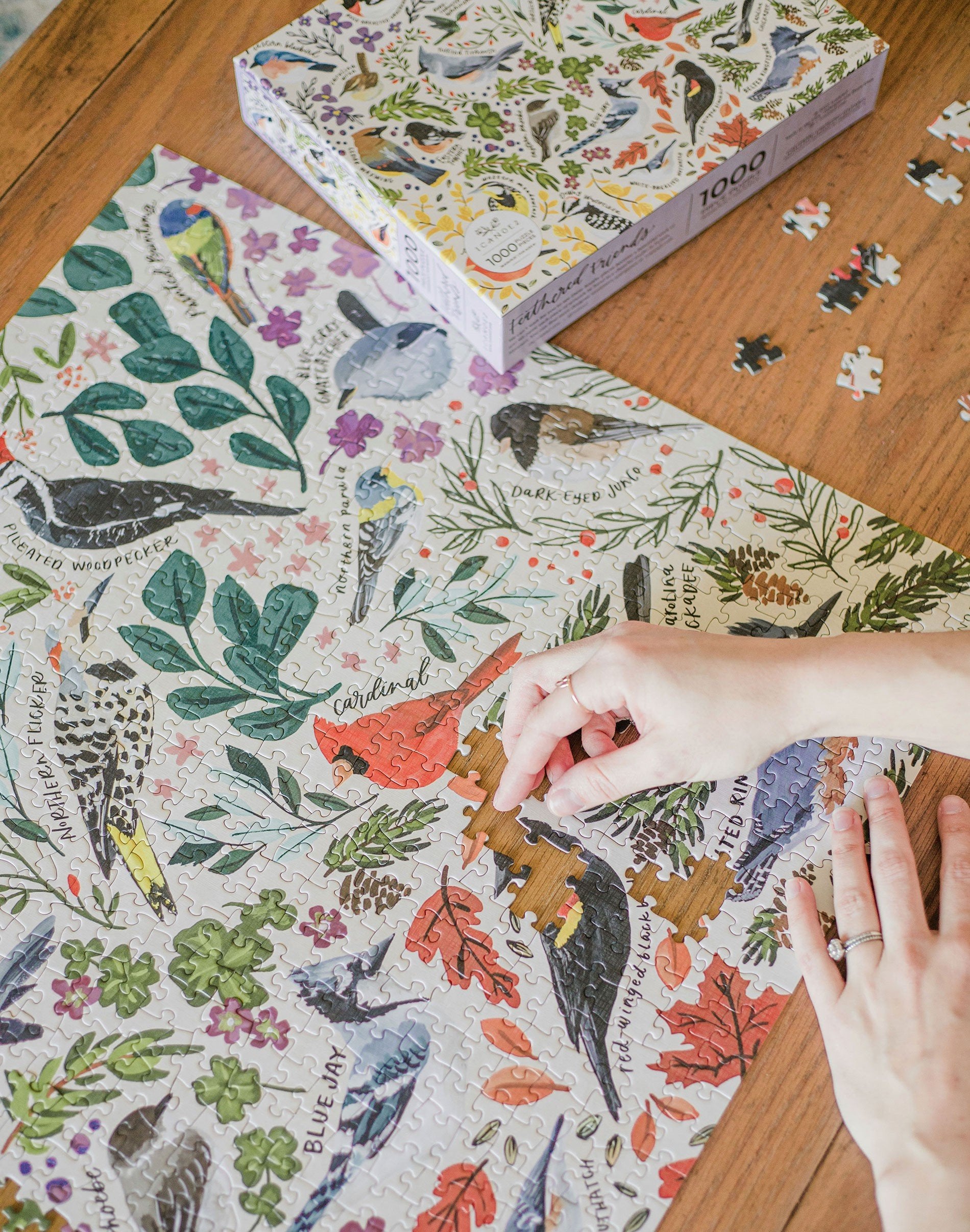 This 1,000 piece puzzle features a variety of beautifully hand-painted birds such as the blue jay, goldfinch, cardinal, chickadee, hummingbird, wren, a few woodpeckers, and more! Each species' name is hand-lettered making this puzzle a fun and educational activity for kids (recommended ages 8+) and adults.