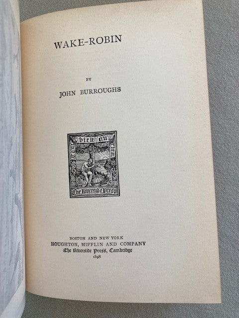 Very good hardcover. Non-authorial inscription on FEP. TEG. Brown cloth spine over green cloth-covered boards - beginning to fray at corners and some rubbing. Cover designed by Sarah Wyman Whitman. The Riverside Press, Cambridge, Mass. 1898. Wake-Robin was the first of John Burroughs' essay collections, and this is a lovely early edition.